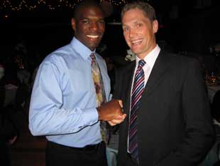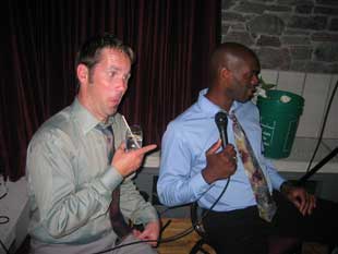 Shaking hands after a successful trade summit. Sam will "buy" Curtis a drink in exchange for Curtis' dessert. |