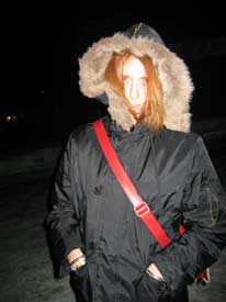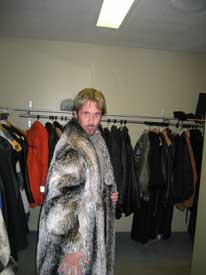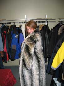 | Trying on some coats in the coat room. |