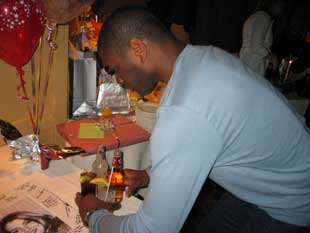 Sam deftly manages 4 drinks at once. |