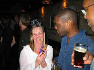 Everyone looks in amazement at Joy and her Amish-like camera. |