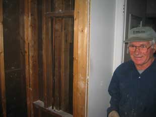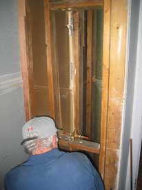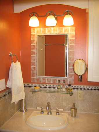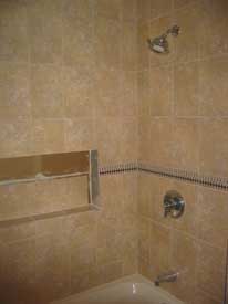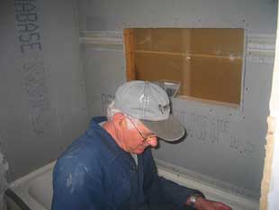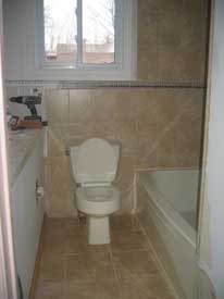 I started ripping out the tile around the old tub on December 2, 2004. My dad the plumber helped out the first weekend with installing the tub and fixing some other plumbing issues. The first phase of the project (installing the tub and toilet and tiling the tub and floor) took about a week to get done. The counter and cabinets took much longer than I anticipated to arrive, so I had a half-finished bathroom for most of January. I used that time to redo the electrical wiring and install a ceiling fan (which involved a lot of wriggling through crawlspaces and attics).