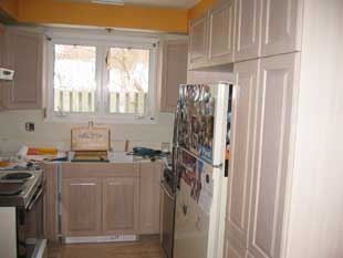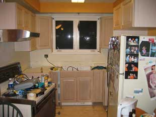 I did the reno in several stages. First I removed the old upper cabinets and installed the new ones without removing the bottom ones. This allowed me to keep using the existing cabinets to store stuff without having to move everything to another part of the house. Then I removed the lower cabinets and installed the new ones. This made installing the countertop quite a challenge, but thanks to Sam's monkey-like arms, we were able to get it in place without too much difficulty. I was able to continue using the kitchen throughout the project, but since most of my meals take very little time and prep work, it wasn't that big a deal.