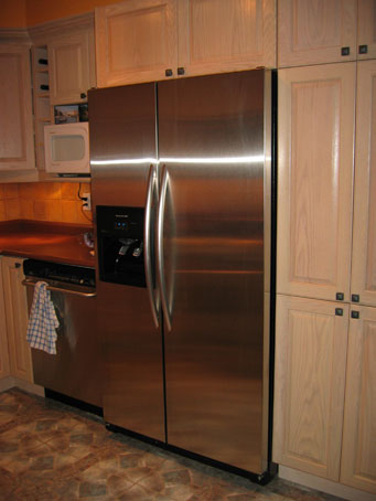 I was pretty satisfied with the finished kitchen, but it wasn't until I decided to get new appliances at the end of 2004 that the kitchen was REALLY done. The new stove is natural gas powered, and the fridge is a counter-depth version that almost looks like a built-in. It's a sweet setup, and I never have to worry about running out of ice when everyone comes over for drinks!