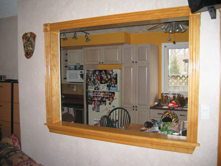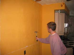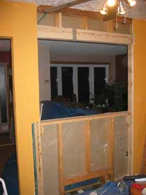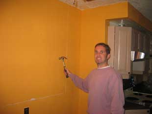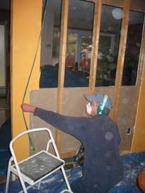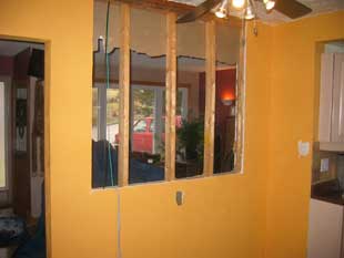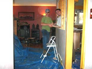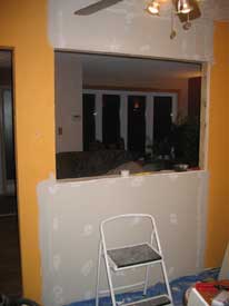 In the winter of 2004, I opened things up by knocking a hole in the wall between the kitchen and living room. It was the best thing I've done, because it really did make a big difference in the overall feel of the place. Lynn's brother Tom came over to help, because he's an expert on holes.